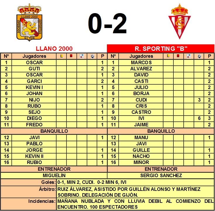 A los tres minutos una combinación entre los delanteros de Mareo, acabo con el balón a los pies de Cudi que de disparo cruzado en el interior del área, batió a Oscar. Tres minutos más tarde, un balón despejado por el portero del Llano en el vértice del área grande, llega a los pies de Ivi quien no se lo piensa y desde unos 35 metros dispara a portería vacía y pone el 0-2. Hasta el final, poca historia. Mayor dominio rojiblanco con algunas llegadas a ambas porterías aunque ya no habría mas movimientos en el marcador.