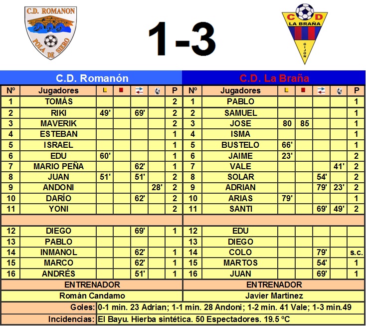 Flojo partido en el Bayu entre dos equipos que a priori debieron mostrarnos más. El primer tiempo se caracterizó por constantes imprecisiones y pérdidas de balón en el centro del campo lo que provocó un juego tosco e impropio de la categoría. Algún disparo lejano que no inquietó ni a Tomás ni a Pablo hasta el minuto 23 cuando Adrián tras una buena jugada de Vale adelantó a los gijoneses. El gol pareció despertar al Romanón que 5 minutos mas tarde empataba el choque por medio de Andoni que finalizaba una combinación entre Darío y Yoni. Buena definición del delantero poleso. El empate devolvió al encuentro al estado de caos anterior y no pasó nada reseñable hasta el minuto 41, una excepcional combinación entre Arias y Jose que termina con un pase atrás para que Vale envíe al fondo de la meta de Tomás que no puede hacer nada a pesar de la estirada. Con el 1-2 en el marcador nos fuimos al descanso. Poco cambió en la dinámica del partido al comienzo de la segunda mitad. Salió mejor La Braña y en el minuto 49 se encontraría con el tercer tanto que casi definía el encuentro a su favor. Llegaría el gol por medio de Santi. A partir de aquí el protagonista sería el colegiado que a falta de fútbol ofreció cartulinas amarillas e incluso expulsó a Jose en los gijoneses por doble amonestación a falta de 5 minutos para el final. Partido aburrido a pesar de los cuatro goles. Resultado justo más por empeño que por juego de los visitantes. Estudiantes y San Claudio se repartieron los puntos