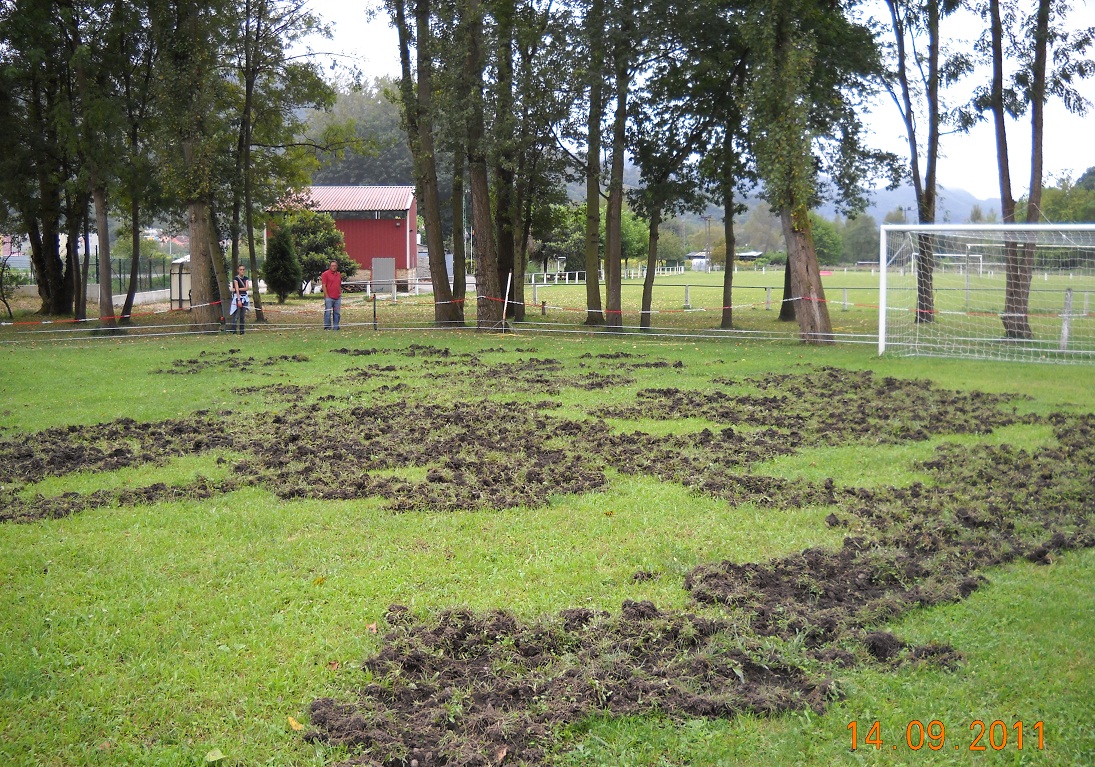 El recién inaugurado campo de El Llerón III fue invadido este fin de semana por los jabalís. El pasado sábado hacíamos eco de la inauguración del nuevo campo de Fútbol 8 de la Peña Tudelano, denominado El Llerón III, que coincidía con la celebración del 2º Torneo Alevín Peña Tudelano F-8. El campo presentaba el buen aspecto que se puede apreciar en la foto, con un prao cuidado y recién segado. Fue precisamente unos días después, cuando los directivos del Tudelano se encontraron el campo destrozado tras la visita de los jabalís. Con el comienzo de la liga a la vuelta de la esquina, la directiva tratará de adecentar lo antes posible el campo para que pueda ser utilizado.