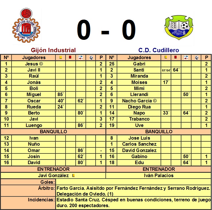 Los primeros minutos del partido fueron de tanteo midiendo las fuerzas, el Industrial quería controlar más el balón mientras el Cudillero se encontraba cómodo y muy bien plantado en el terreno de juego. La primera ocasión de peligro llegó en el 10´ cuando un cambio de banda de Oscar hacia Javi permitió a Javi controlar en la esquina izquierda del área, cuyo centro no logró rematar Berto con el intento de chilena. Boli se fue haciendo con el control del medio campo aunque e ocasiones se excedió al entrar sobre los contrarios. Esto permitió que el Cudillero no lograra acercarse al área local, pero el Gijón Industrial tampoco concretaba su dominio en ocasiones. Los acercamientos del Gijón Industrial se redujeron a las faltas cercanas a la frontal que forzaba Luengo, omnipresente hoy. Todas eran lanzadas de la misma forma, Luengo abría a la izquierda con Berto haciendo la pantalla. Boli remataba fuerte con la zurda pero no lograba tirar entre los tres palos. En el 30´ Rueda roba un balón en el medio juega rápido para Luengo quien avanza sin oposición el disparo de la frontal es despejado por Miranda, el rechace le cae a Javi que no logra aprovechar el balón ante la presión del portero y Trabanco. Sería de nuevo Javi quien dispondría de la siguiente ocasión en el 32´ aprovechando un centro de Javi II desde la derecha, remata de volea desde la frontal pero no puede evitar que el balón pase rozando el larguero. Eran los minutos de mayor dominio local que acosaba el área rival, los últimos minutos el Cudillero demostraría que estaba en el partido con intentos de contras que eran abortadas por los centrales locales. La segunda parte comenzó igual que la primera parte, con miedo a acercarse al área rival, dando la sensación de que ambos equipos se conformaban con el empate. En el 56´ sacaría Luengo una falta desde la izquierda al segundo palo donde Javi muy forzado remata de cabeza rozando el palo. El Industrial fue haciendo valer su condición de local para hacerse con el dominio del medio campo donde estaba la gran parte del juego. Así avanzaba el partido hasta que Santi fue expulsado por doble amarilla en 5 minutos tras ser sancionado por sendas manos. Esta expulsión hizo que el Gijón Industrial se tirara arriba a por el partido mientras que obligó a Iván Palacios a recolocar sus fichas, dispuso un 4-2-1-2, con una sólida colocación y esperando al rival en su campo. Esta disposición se mostró al final, muy acertada pues el Cudillero logró defender su portería sin excesivos problemas. Y así fue como el Cudillero dispuso de las dos ocasiones más claras del partido, la primera en el 70´ cuando saca de banda Uve para que centre Gabino al segundo palo donde Diego Rua remata a bocajarro y obliga a Jesús a demostrar sus reflejos. En el 80´ Llerandi saca una falta rápidamente pillando desprevenida a la defensa Nacho García le gana la espalda a sus marcadores pero no logra superar la salida de Jesús. Fotos