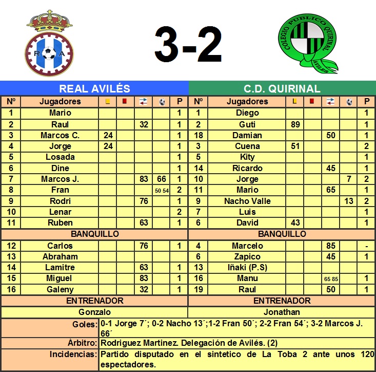 El banquillo local pareció descolocado ante el primer gol de los visitantes, pero el entrenador transmitía tranquilidad a sus chicos. Apenas se llevaban 5 minutos de juego. En el minuto 12 llegó la primera ocasión para los locales, cuando Rubén se encontraba un balón suelto en el lateral del área pequeña, pero su disparo se iba por encima del larguero. En la siguiente jugada llegaba el segundo gol del Quirinal, el cadete de primer año Nacho recogía un balón fuera del área en la izquierda y su disparo seco y abajo lograba perforar la meta local. El Quirinal estaba dos goles arriba en el marcador gracias a dos acciones aisladas, pero su defensa lograba cortar muy bien los avances de los locales, ayudados por el trabajo destructivo de David en el centro del campo. En el minuto 31 Jorge pelea un balón con los defensas y cede para Nacho Valle, quien solo contra el portero echa el balón arriba en lo que podía haber sido la sentencia del partido. El Avilés seguía insistiendo en su ataque, pero no encontraba las fisuras en la defensa local, hasta que en el minuto 39 el dorsal 6 del Avilés lanzaba un fuerte disparo desde la frontal que era despejado de puños por el portero visitante. El descanso pareció sentar mejor a los locales, pues a los 5 minutos de la reanudación, Fran reducía distancias. Un disparo desde la frontal botaba frente al portero y se colaba en el interior de la portería del Quirinal. El propio Fran lograba la igualada 4 minutos después con una entrada en velocidad al segundo palo y batiendo por bajo al portero del Quirinal. El gol fue muy protestado por el banquillo del Quirinal, al entender que entraba en posición de fuera de juego. El gol decisivo del partido llegaría en el minuto 66 cuando Rodri entraba por banda y cedía para Marcos quien golpeaba primero en un defensa y en segunda instancia lograba anotar el gol de la victoria para los locales. La polémica del partido llegó en la última jugada, cuando el banquillo del Quirinal reclamó penalty sobre Jorge por un empujón dentro del área. La jugada fue resuelta por Rodríguez Martínez pitando el final del partido. Jorge tubo que ser asistido al golpearse con el poste de la portería en su caída. El Quirinal, a pesar de ser un recién ascendido, mostró su peligro ante un equipo llamado a estar en la zona noble de la clasificación. |