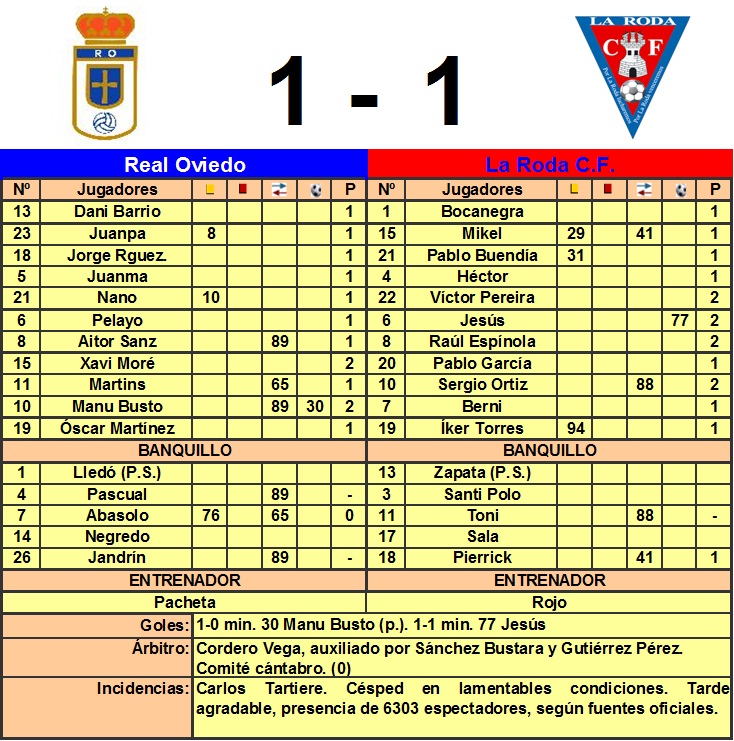 Pacheta sorprendía relegando a Negredo al banquillo en detrimento de Juanma, ocupando Nano el lateral izquierdo. Pronto se vio lo que iba a ser el partido, con dos amonestaciones rigurosas a Juanpa y Nano, un recital del colegiado cántabro, Cordero Vega, que acabó desquiciando a los dos equipos. La primera jugada polémica, que sería la primera de peligro clara, sería en el minuto 24, cuando Xavi Moré se plantaba sólo ante Bocanegra, pero el auxiliar Gutiérrez Pérez invalidaba la jugada por fuera de juego ante el asombro de 6000 personas que se pusieron en pie para protestar la jugada. El Oviedo no estaba trenzando buen juego, la situación del campo no lo permitía en la zona de ataque, pero en el minuto 29, una jugada individual de Óscar Martínez desde la izquierda finaliza con derribo en el área y penalti claro, que transforma Manu Busto abajo a su izquierda. El Oviedo fue de menos a más y acabó a un nivel aceptable el primer tiempo. En el minuto 39' Ricardo Gil, segundo entrenador azul, cosechaba su segunda expulsión de la temporada por roja directa. Pudo empatar La Roda en el 44' con un cabezazo de Buendía al segundo palo tras el saque de una falta y que se fue alto. En la segunda mitad el Oviedo gozó de ocasiones para llevarse el partido, la primera en el 49', un centro de Manu Busto que cabecea fuera por poco sólo Óscar Martínez. Si en la primera parte el Oviedo había ido de menos a más... en la segunda todo lo contrario, llegando el control de la Roda mediada la 2ª mitad y consiguiendo el gol en el minuto 77, un centro desde la derecha en el que Juanma y Jorge Rodríguez hacen de sandwich a Dani Barrio y Jesús marca a placer el empate. La entrada de Abasolo restó más que aportó, el jugador vasco cuenta con la confianza de Pacheta, que insiste en meterlo en momentos poco oportunos para mostrar su juego, ya que dejó claro su perfil de jugador, en el que no entra defender un resultado. Tras el empate, el marcador pudo variar en los dos numeradores. En el 82' Xavi Moré remató forzado ante Bocanegra a pase de Óscar Martínez y en la siguiente jugada Íker Torre era derribado en el área oviedista en un clamoroso penalti, que motivaba una vergonzosa actitud del entrenador manchego, Antonio Cabezuelo "Rojo", que era expulsado por sus protestas y provocaciones a la afición local, a lo que se negó a abandonar el terreno de juego, consiguiendo lo que buscaba, la pérdida de tiempo. 5 minutos tardó en abandonar el terreno de juego, escoltado por la policía nacional. Un espectáculo a la altura de Mourinho. Hasta el final, el Oviedo lo intentó bombardeando balones sin sentido. Pacheta introdujo en el 89' a Jandrín y Pascual, que estuvieron en el banquillo casi 10 minutos esperando para entrar al terreno de juego sin que el entrenador burgalés diese la orden. El Oviedo mostró una mala imagen, consiguió crear más ocasiones que su rival, recién ascendido, que dio muestras de hacer muy poco para poder llevarse un empate que le satisfacía. Rueda de prensa. José Rojo. "Pacheta" El entrenador azul se mostró calmado en la rueda de prensa, optimista y con confianza en sí mismo y en su equipo, defendió el juego e insistió en que va a seguir en la misma línea. "Hemos creado muchas más ocasiones que el rival y ese es el objetivo, hacer más ocasiones que el rival. La Roda se ha llevado mucho premio, no han sido mejores que nosotros". Pacheta cree que en el segundo tiempo "no hemos estado tan intensos como en el primero, y seguimos pagando muy caros los errores, hubo un momento del partido en el que pudimos perder", aunque no entró a valorar el posible penalti a Íker Torre. El técnico burgalés insistió en las ocasiones de gol que creó el equipo, achacando a que los jugadores están "precipitados de cara a gol, pero cuando entren la situación cambiará". De La Roda comentó que es un "equipo muy práctico, lo hace casi todo bien. Están disfrutando en la categoría, cosa que nosotros no estamos haciendo".
