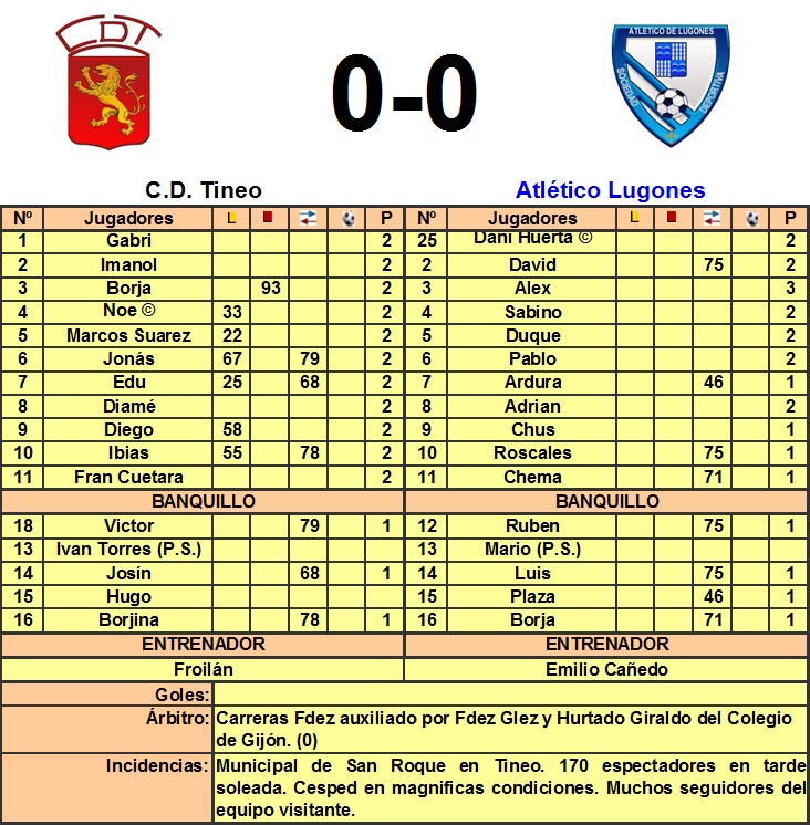 Partido muy disputado entre dos de los gallitos de la categoría, aunque el respeto de unos y otros impidió ver un gran partido de la calidad de ambos onces. El encuentro tuvo una parte para cada equipo y, aunque fue el Tineo el que gozó de una primera ocasión de gol en la cabeza de Diego que remataba por encima de la portería de Dani Huerta en el minuto 6, no tardaron los de Cañedo en responder, y de que forma, a la portería local. En el minuto 8 gran jugada del Lugones con un gran pase de Chema a Chus, éste de cabeza se la pasa a Roscales, que se planta ante Gabri, le pica el balón pero éste se estrella en el palo derecho de la portería local. Sólo tres minutos después, en el 11, un balón en profundidad hacia Chus, que coge perfectamente la espalda a la defensa local, se planta de nuevo ante Gabri y su vaselina se estrella en el larguero de la portería. El resto de la primera mitad solo valió, para observar el miedo de los dos equipos y sobre todo el temor de los locales a verse de nuevo sorprendidos en alguna contra. La segunda mitad comenzaba con un clarísima ocasión de gol para el Lugones, cuando tras un saque de esquina el balón llegaba a los pies de Carlos Plaza, que a un metro de la portería remataba y Gabri salvaba con los pies una nueva ocasión de gol visitante. A partir de este momento los locales despertaron de una vez por todas y así en el minuto 58 se produce un derribo clarísimo de Dani Huerta a Diego cuando ya lo había driblado; el árbitro no sólo no señala la pena máxima, sino que decreta saque de puerta ante las protestas del publico. El encuentro se vuelve duro y el arbitro con sus incomprensibles decisiones exaspera al publico y a los jugadores locales. En los minutos 84 y 85 el Tineo goza de una doble ocasión para conseguir la victoria. En la primera un balón de Diego sobre Borjina que dispara y el balón lo saca Dani con el pie cuando ya se colaba y la segunda en una gran jugada del lateral local Borja que dispara con la pierna derecha, rechaza Dani y Borjina sólo remata fuera en lo que fue la ultima ocasión del encuentro. Al final las increíbles decisiones del colegiado pasaron factura en algunos jugadores y el local Borja fue expulsado por protestar. El