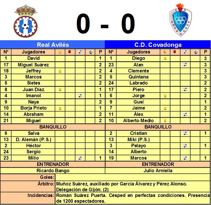Reparto de puntos en el Suárez Puerta, en un partido donde los avilesinos gozaron de más oportunidades, pero que el buen hacer de la defensa del Cova, liderada por sus centrales Clemente y Quintana, dieron al traste con la cuarta victoria consecutiva que buscaban los avilesinos. De una primera mita con dominio del Avilés que buscó más la portería contraria, se pasó a una segunda parte donde los locales buscaron todas las formas de adelantarse en el marcador, con un Miguel como protagonista fallando las ocasiones más claras, junto con el recién incorporado Milio. El Cova por su parte, en el tiempo añadido pudo lograr el gol con una jugada de Gusi sobre Jaime, que envió su remate fuera. El