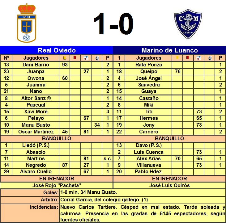 La primera de los carbayones llegó en el 34, por la banda derecha con Xavi Moré, como no podía ser de otra forma, que termina con un centro desde la línea de fondo y remate de Manu Busto a la red. Dos minutos después pudo ampliar distancias, con un tiro al palo de Óscar Martínez, y antes del descanso con un cabezazo de Negredo a la salida de un córner, haciendo tres ocasiones claras cada equipo y llegando al descanso con el 1-0. En la segunda mitad el Oviedo fue dominador claro, aunque la primera ocasión sería para Carnero, que no acertó en un cabezazo al segundo palo. El Marino adelantó líneas en busca del empate, con la entrada de Villanueva y Álex Arias -que debutaba con el Marino tras el accidente sufrido en agosto- y el Oviedo gozó de dos ocasiones claras para sentenciar el partido, en el 76' Manu Busto se plantó ante Rafa Ponzo, pero al driblarlo se escoró demasiado y su remate se fue al lateral de la red y en el 81' Xavi Moré se quedaba sólo ante Ponzo pero cruzaba demasiado su remate. La ocasión más clara llegó en el descuento, Martins en el área pequeña no acertó a enviar el balón a la red cuando todo el Tartiere cantaba el gol. |