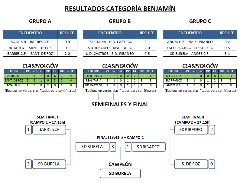 En el campeonato participaron doce clubes del Occidente de Asturias y de Galicia. En total, 25 equipos en tres categorías: Alevín, Benjamín y Prebenjamín. En el cuadro de ganadores, La Caridad Club de Fútbol se proclamó campeón de categoría alevín tras derrotar en los penalties a la SD Burela por 4-3, después del resultado de 3-3 en la final. En benjamines, SD Burela y SD Ribadeo disputaron la final, imponiéndose también el Burela por 3-1. Por último, en la categoría de los más pequeños, los prebenjamines de la SD Ribadeo no dieron opción en la final al Puerto de Vega y vencieron por 4-1. Destacar el buen ambiente vivido a lo largo de todo el día y la deportividad y saber estar de todos los equipos sobre el campo y de las aficiones en las gradas, que animaron sin cesar a los suyos dando un bonito colorido al Torneo. El Andés Club de Fútbol agradece a todos los Clubes su participación, a la Real Federación de Fútbol del Principado de Asturias la designación de árbitros para dirigir este torneo y a los aficionados su asistencia y colaboración, emplazando a todos ya para la próxima edición, que se celebrará en la Semana Santa del año 2013.
